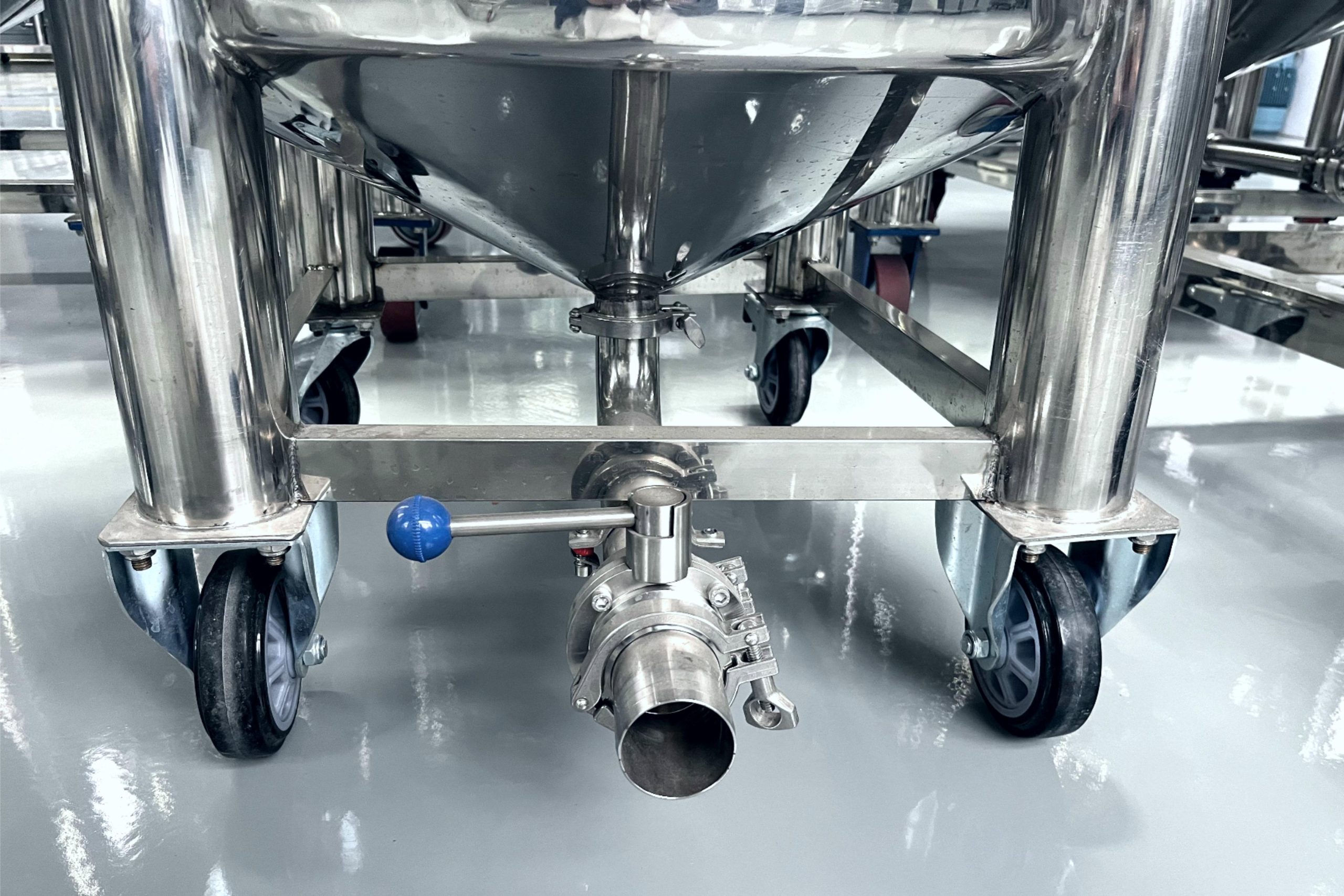 氣動(dòng)攪拌鍋采用SUS316L或SUS304L不銹鋼材質(zhì)制作,配套附件有:進(jìn)出料口、人孔、液位指示器、高低液位報(bào)警裝置、防蠅防蟲(chóng)風(fēng)閥、儀表、CIP清洗噴頭。