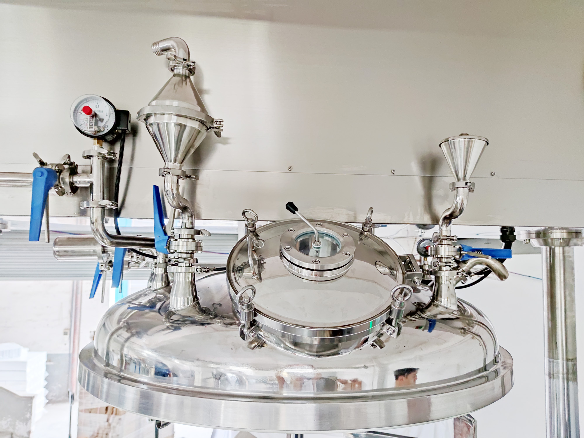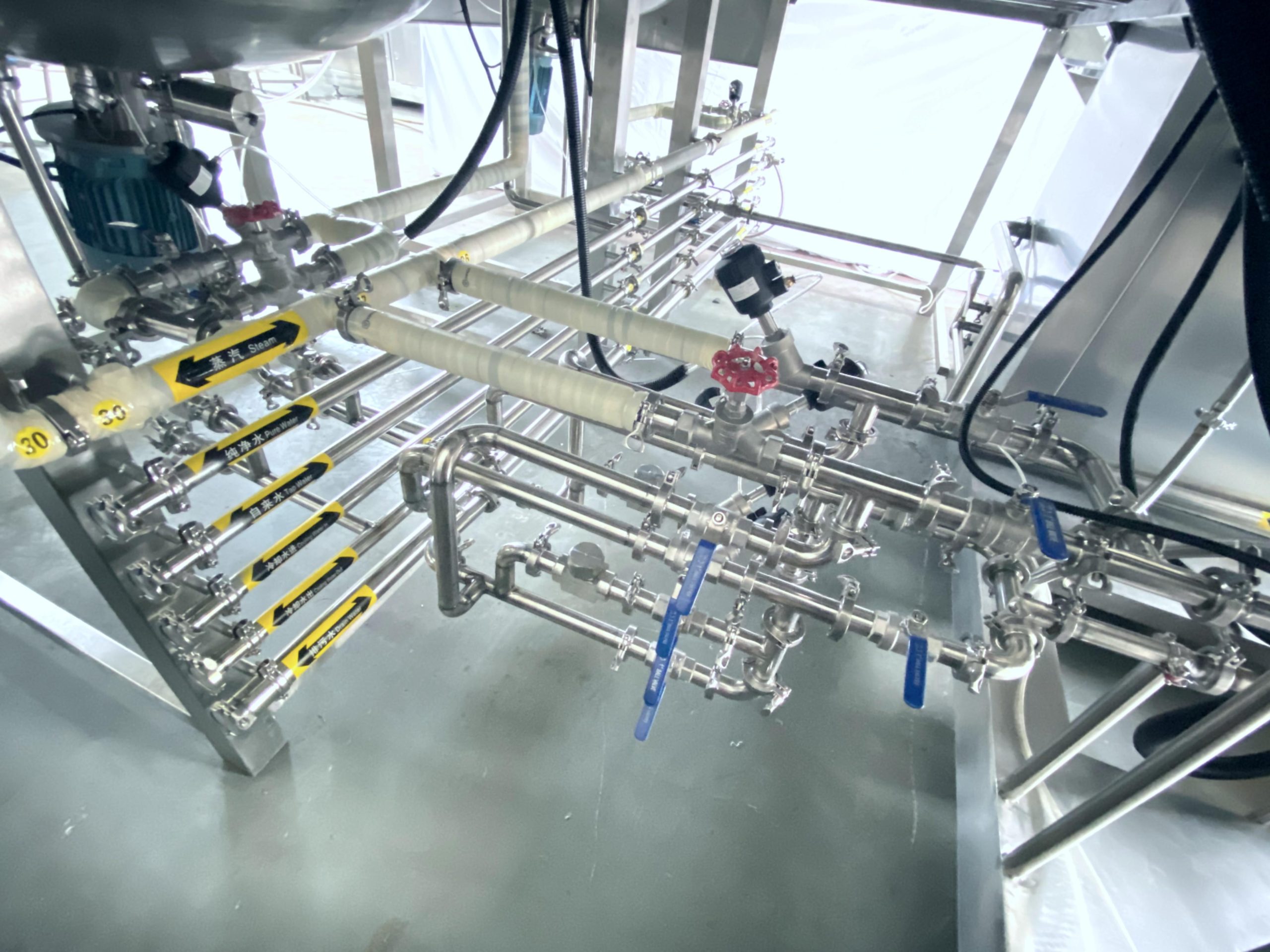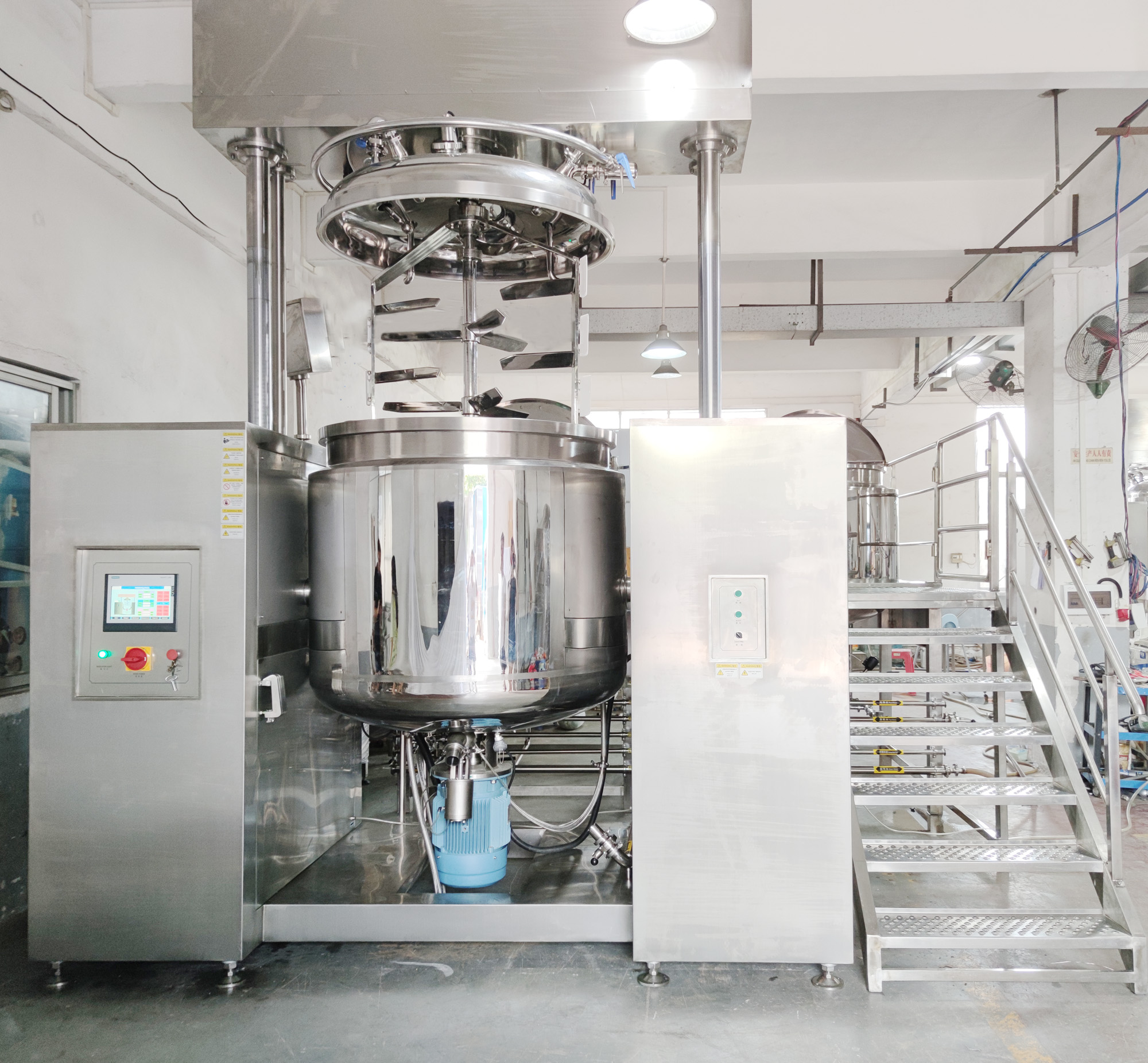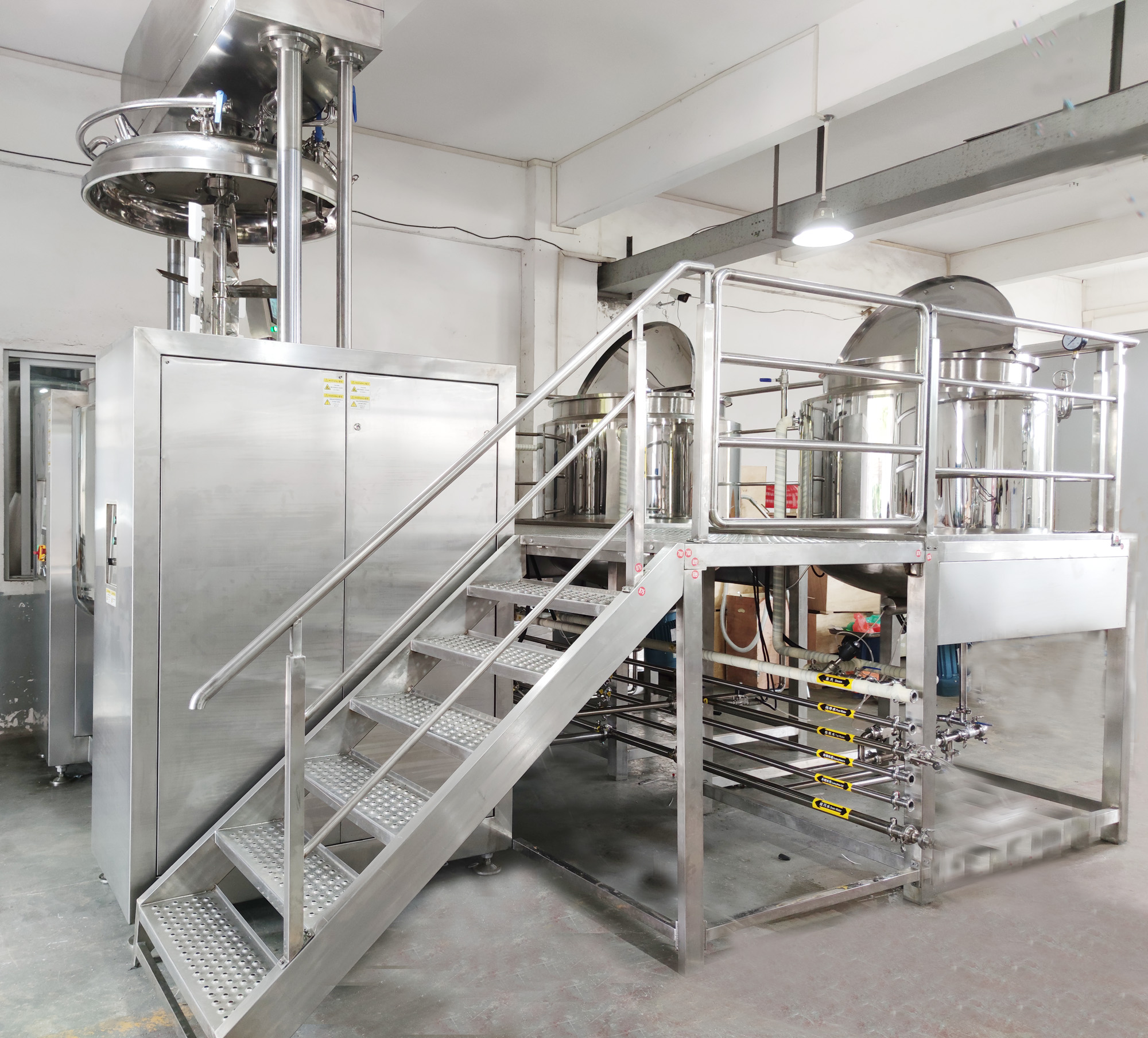 該設備由乳化攪拌罐、水相罐、油相罐、液壓升降系統(tǒng)、控制系統(tǒng)、均質(zhì)器、攪拌系統(tǒng)及真空系統(tǒng)構成。在真空環(huán)境下,通過高剪切乳化機實現(xiàn)多相物料的高速均勻分散。物料在轉子與定子構成的狹小空間內(nèi),借助設備產(chǎn)生的強大動能,經(jīng)受液壓剪切、離心擠壓、沖擊破碎及湍流等多重作用,實現(xiàn)瞬時均勻分散乳化。經(jīng)高頻往復循環(huán)處理后,最終獲得穩(wěn)定性優(yōu)異且無氣泡的高品質(zhì)成品。