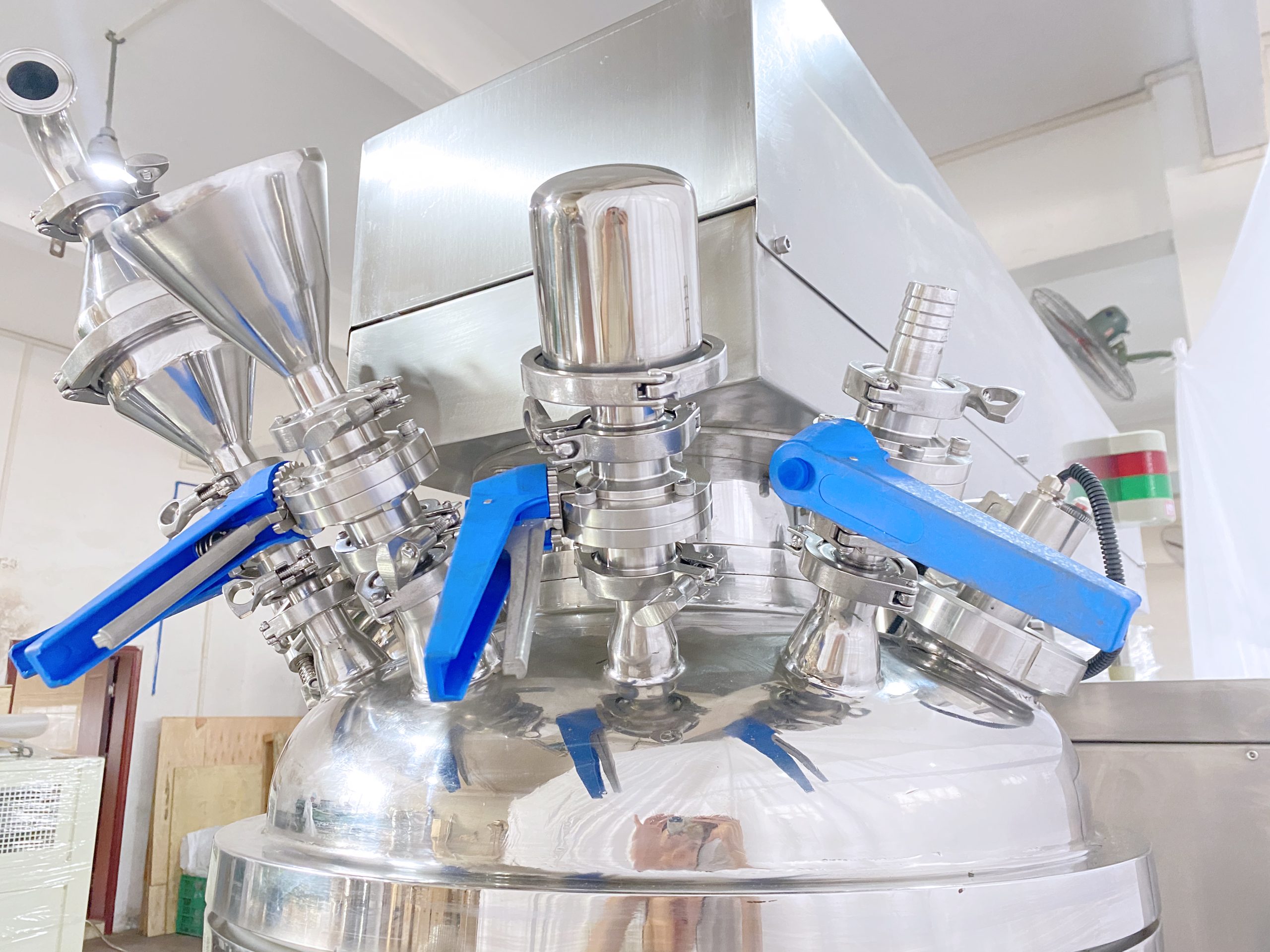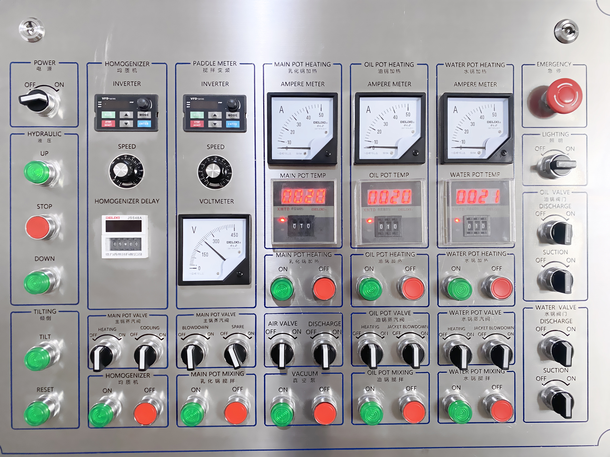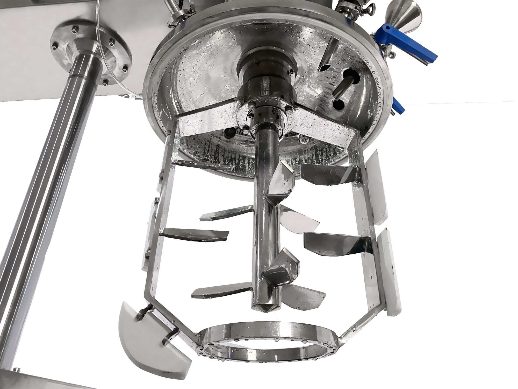 該設(shè)備由乳化攪拌罐、水相罐、油相罐、液壓升降系統(tǒng)、控制系統(tǒng)、均質(zhì)器、攪拌系統(tǒng)及真空系統(tǒng)構(gòu)成。在真空環(huán)境下,通過(guò)高剪切乳化機(jī)實(shí)現(xiàn)多相物料的高速均勻分散。物料在轉(zhuǎn)子與定子構(gòu)成的狹小空間內(nèi),借助設(shè)備產(chǎn)生的強(qiáng)大動(dòng)能,經(jīng)受液壓剪切、離心擠壓、沖擊破碎及湍流等多重作用,實(shí)現(xiàn)瞬時(shí)均勻分散乳化。經(jīng)高頻往復(fù)循環(huán)處理后,最終獲得穩(wěn)定性?xún)?yōu)異且無(wú)氣泡的高品質(zhì)成品。